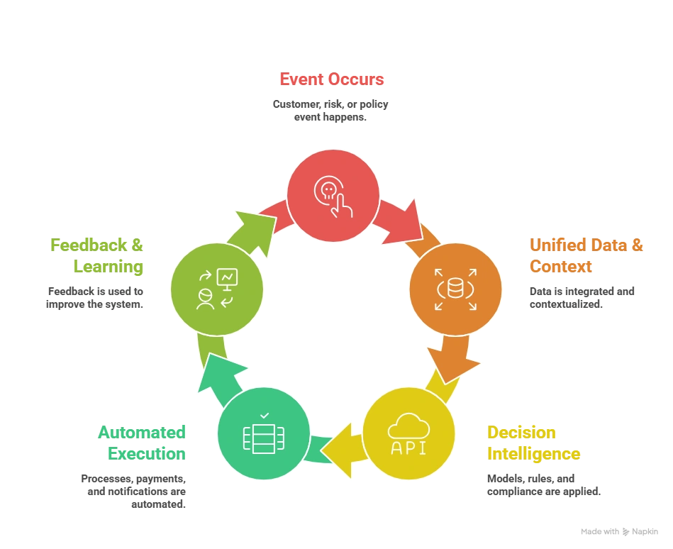Decision Automation: The use of rules, analytics, and AI to automate underwriting, claims, and compliance decisions with speed and consistency.